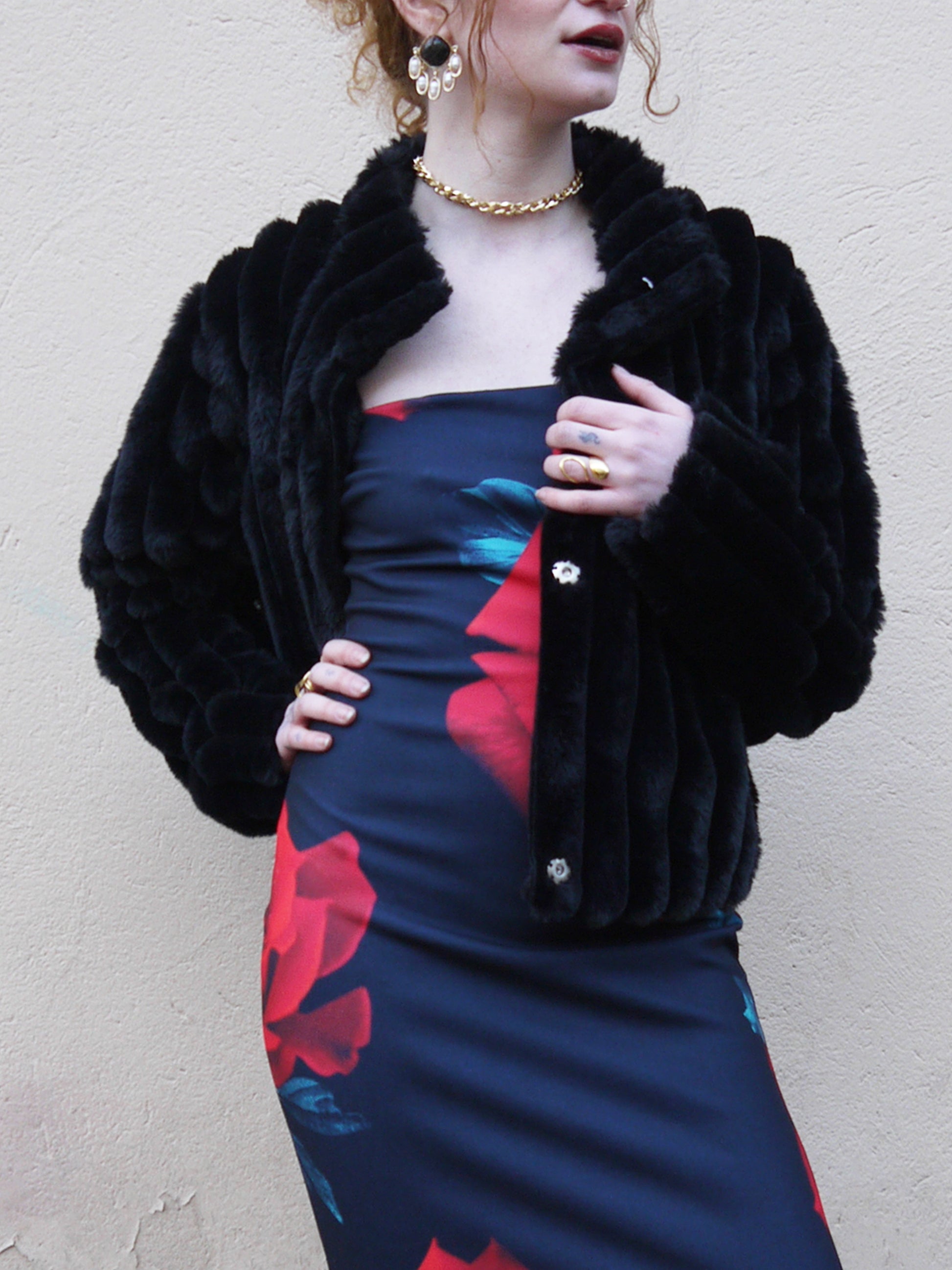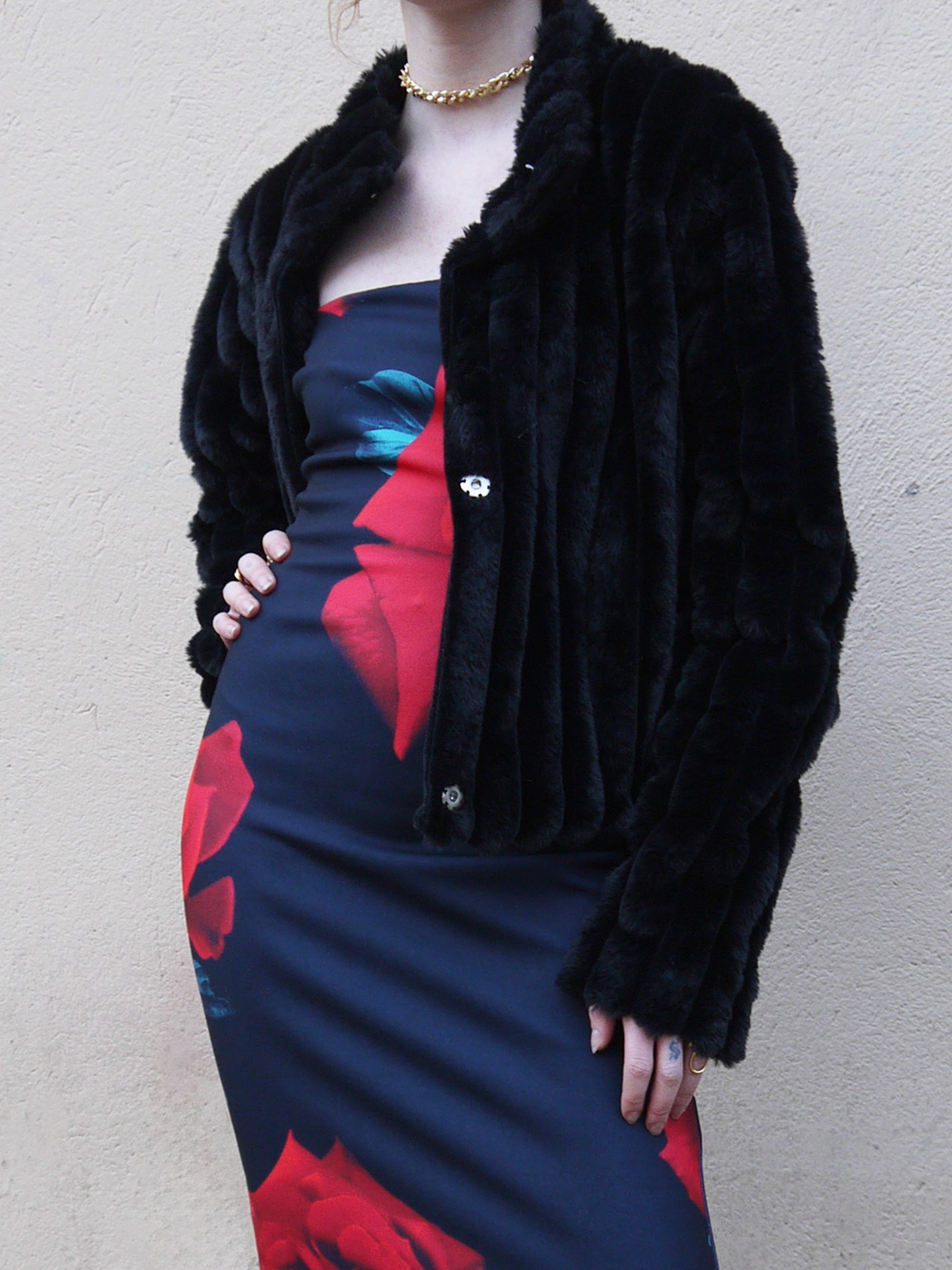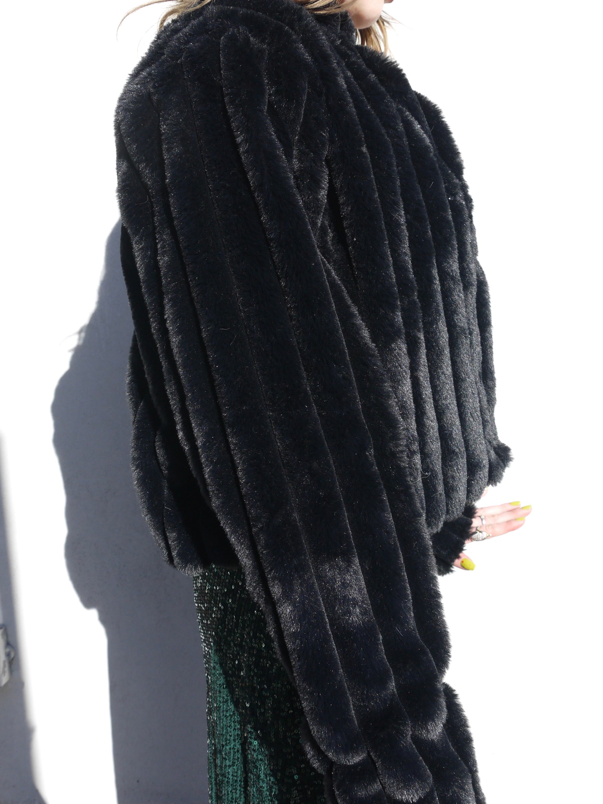 This faux fur crop jacket features intricate puffer-style stitching, creating a unique and stylish look. The cropped length and round shape provide a flattering fit, making it a versatile addition to your wardrobe.