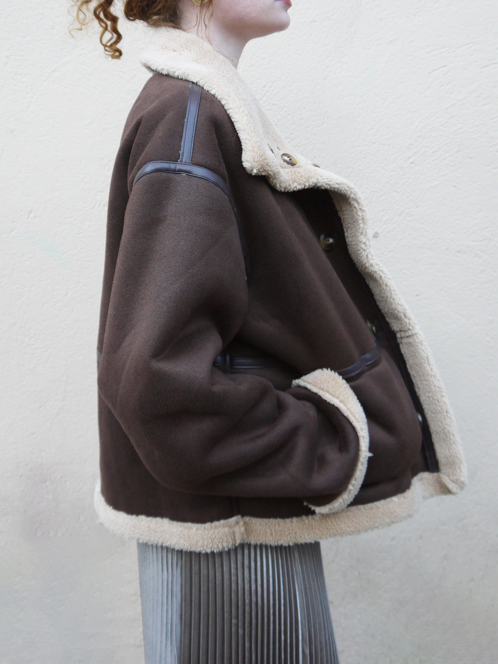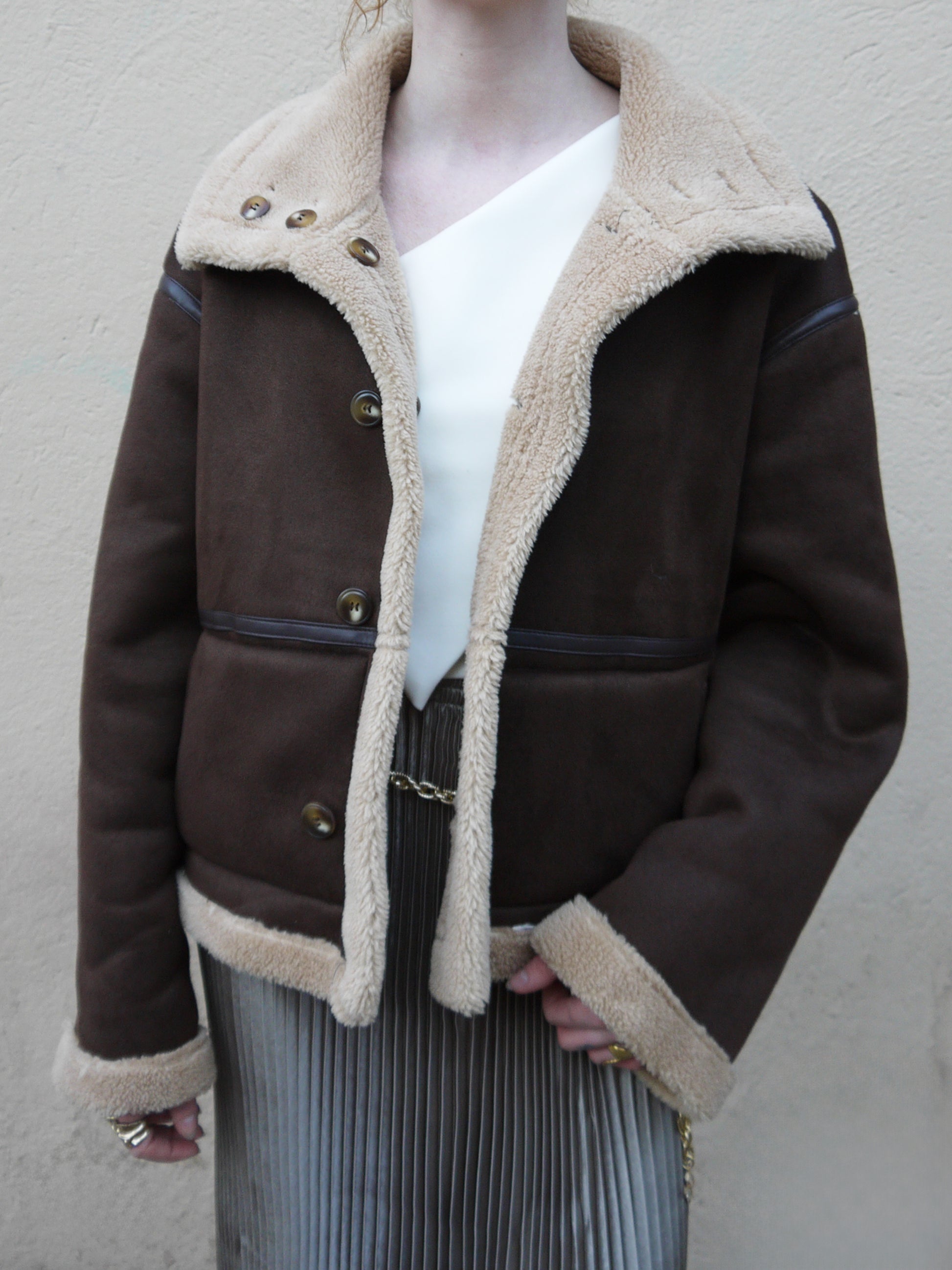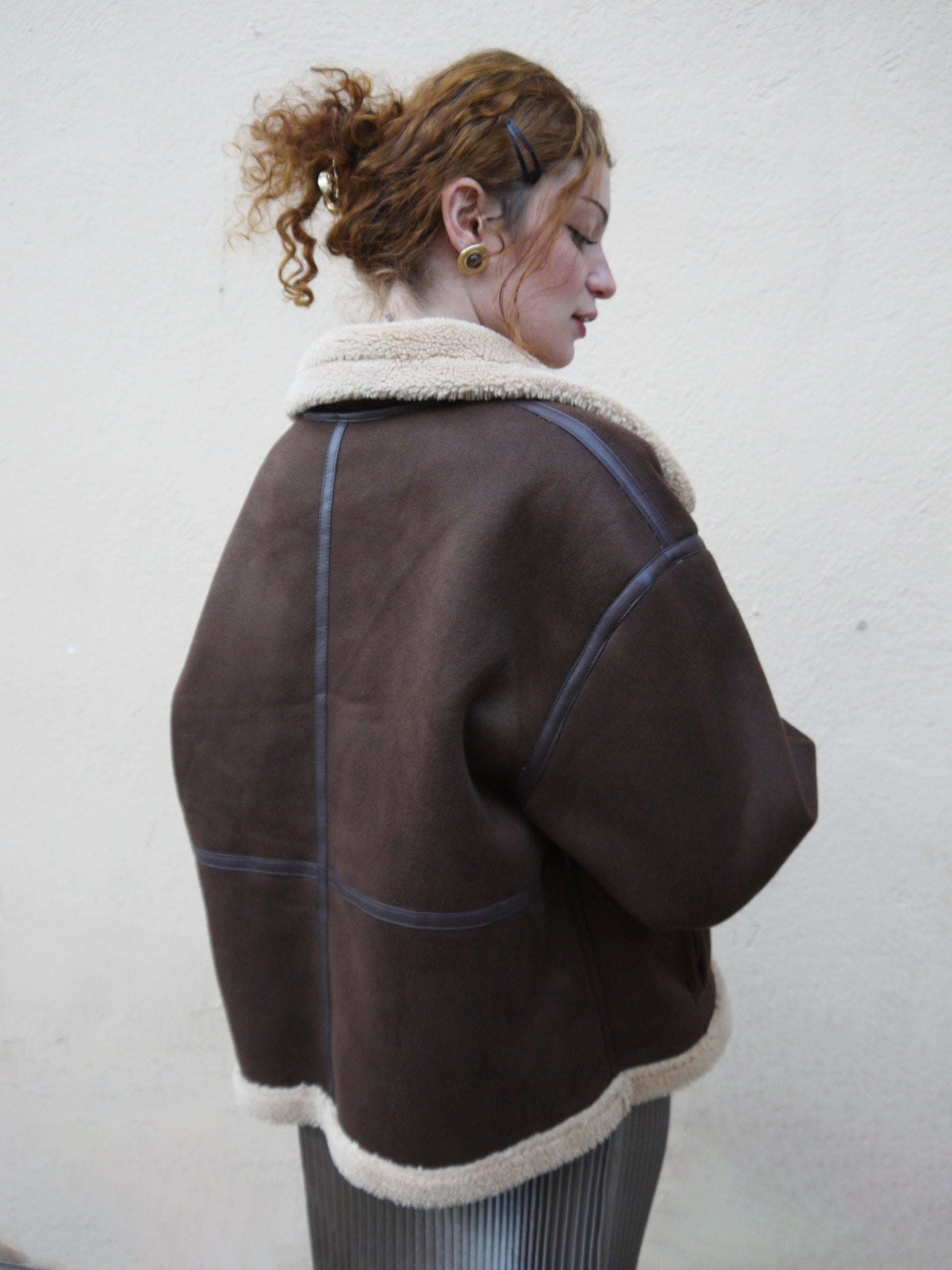 Stay warm and stylish with our reversible jacket. With an oversized fit and a fuzzy collar and trim, this short jacket is perfect for chilly days. Versatile and cozy.