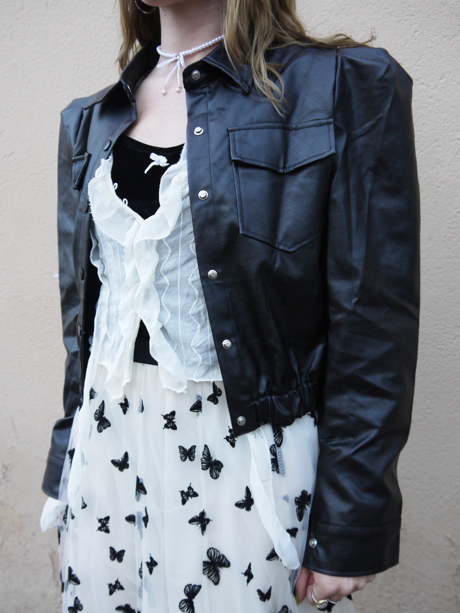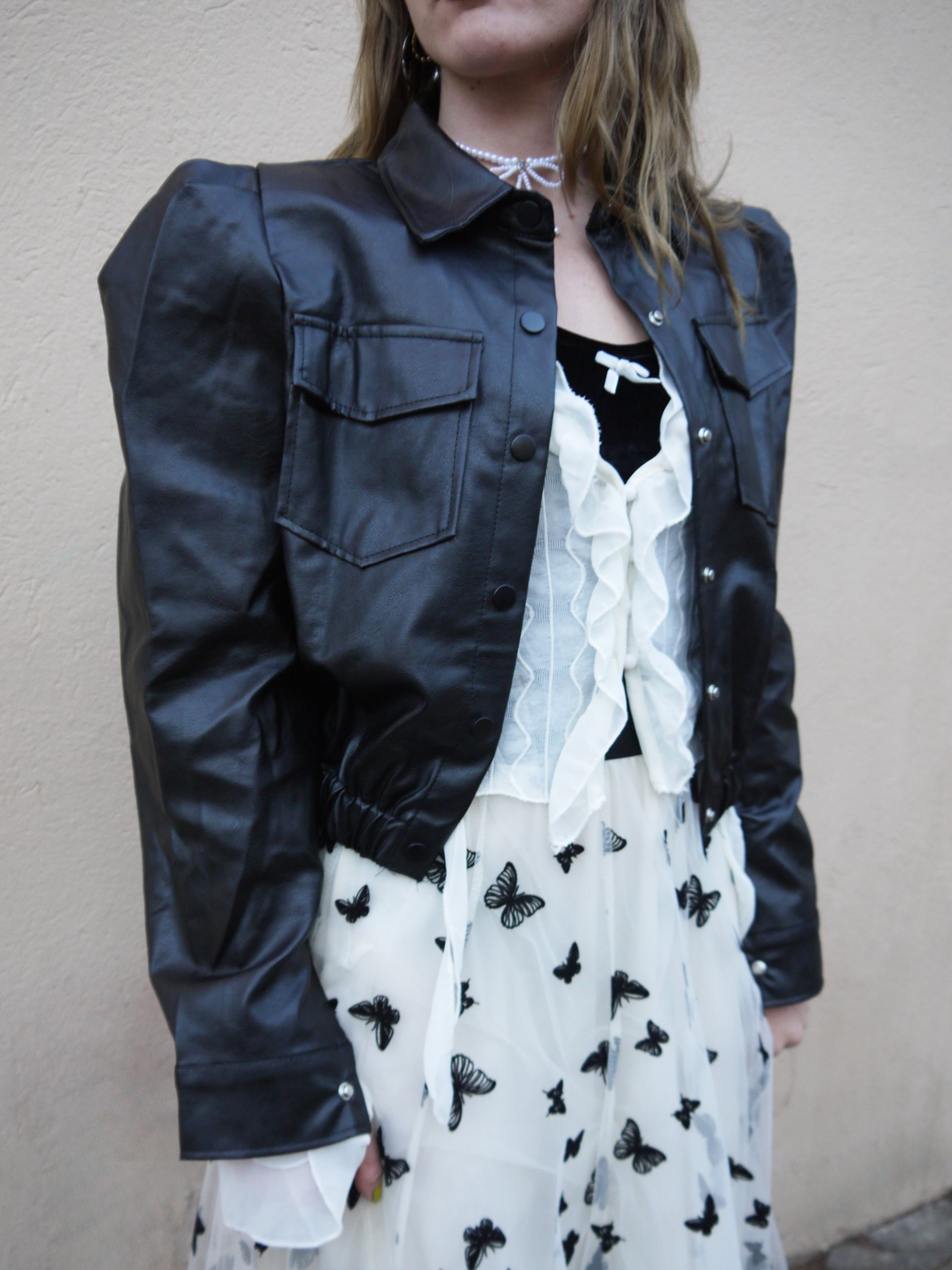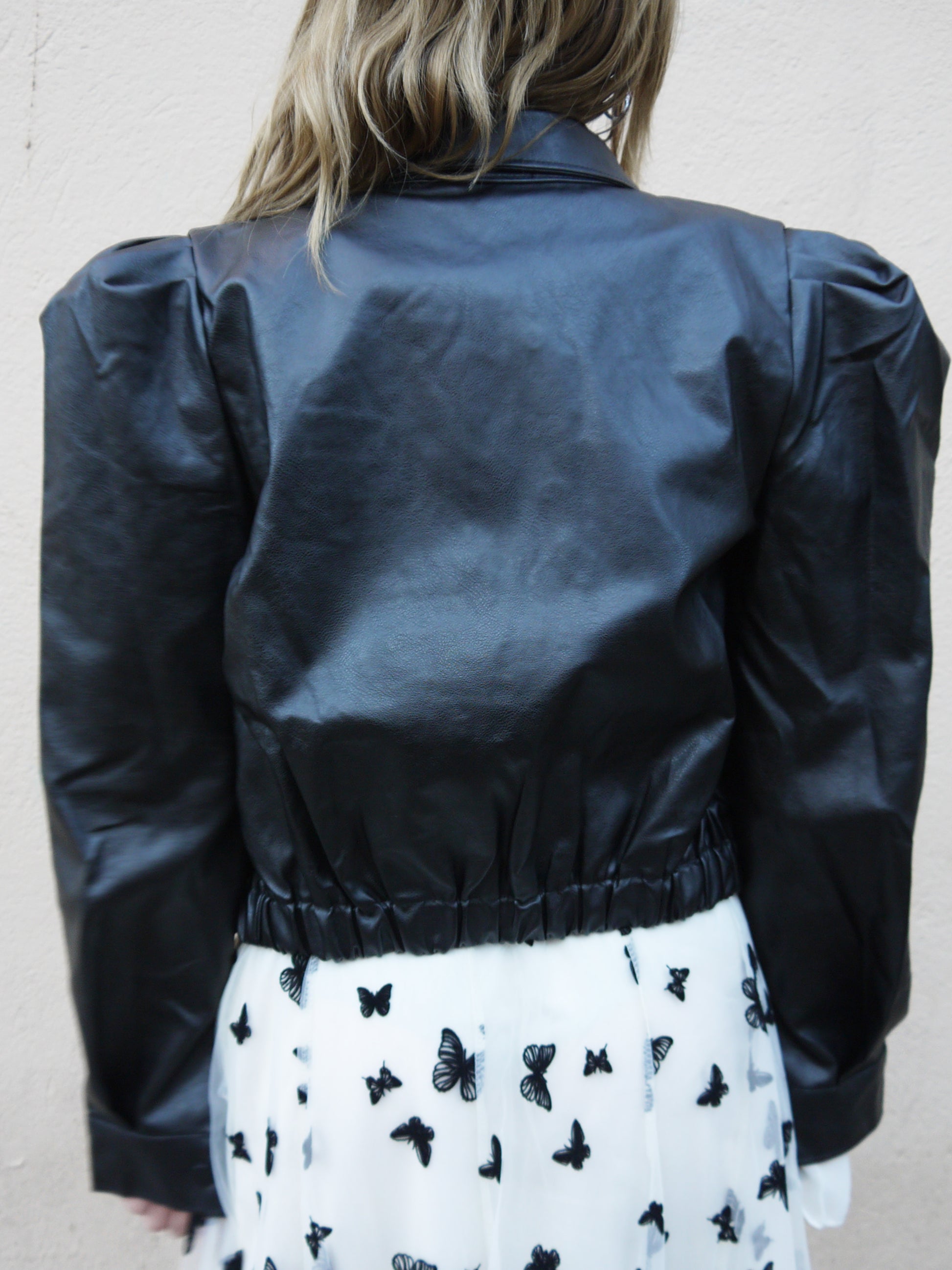 Elevate your style with our crop faux leather jacket. Featuring puffy shoulders and a flattering silhouette, this jacket adds an edgy touch to any outfit. Its cropped design is perfect for showing off your waistline and creating a chic look.