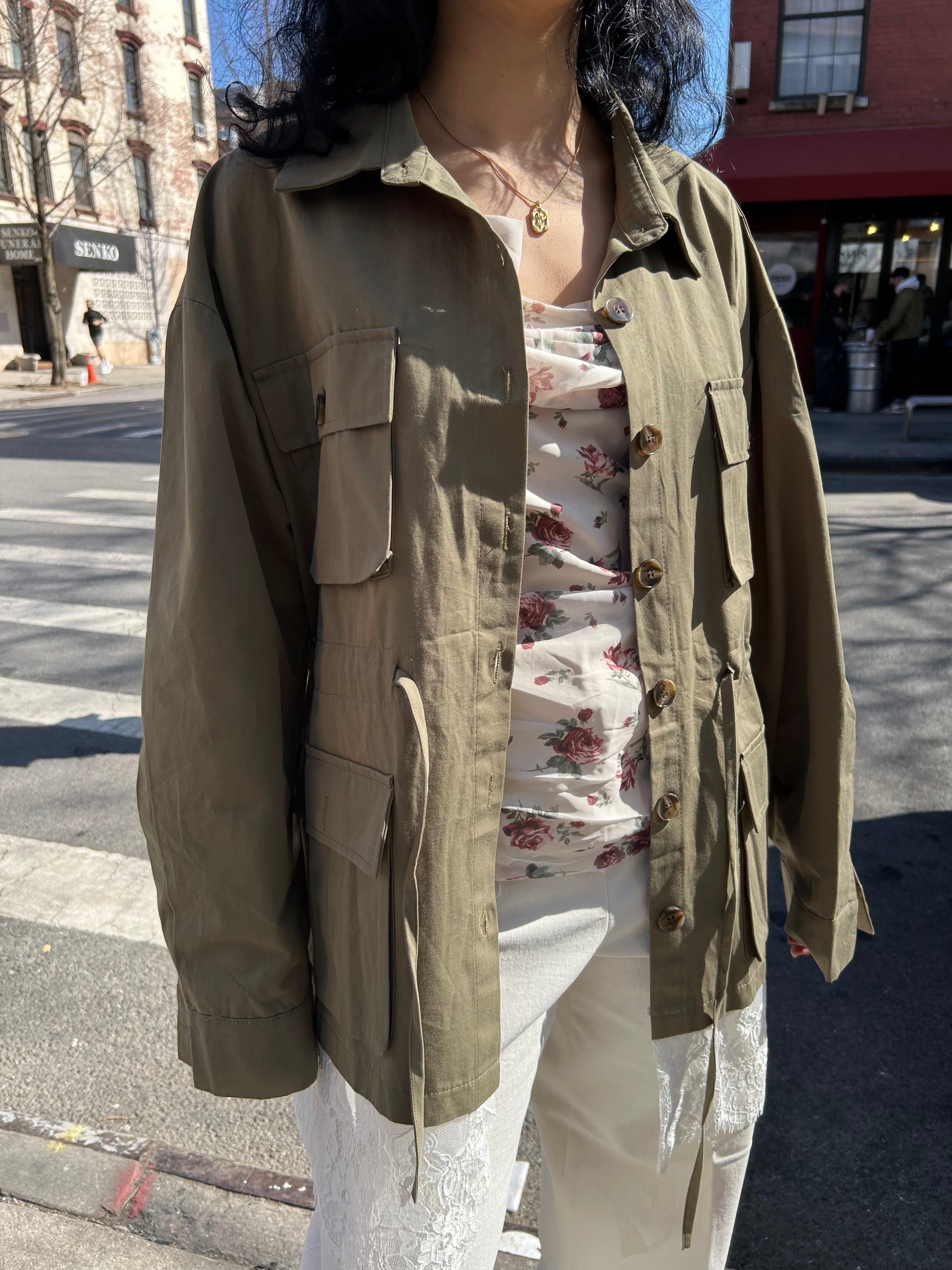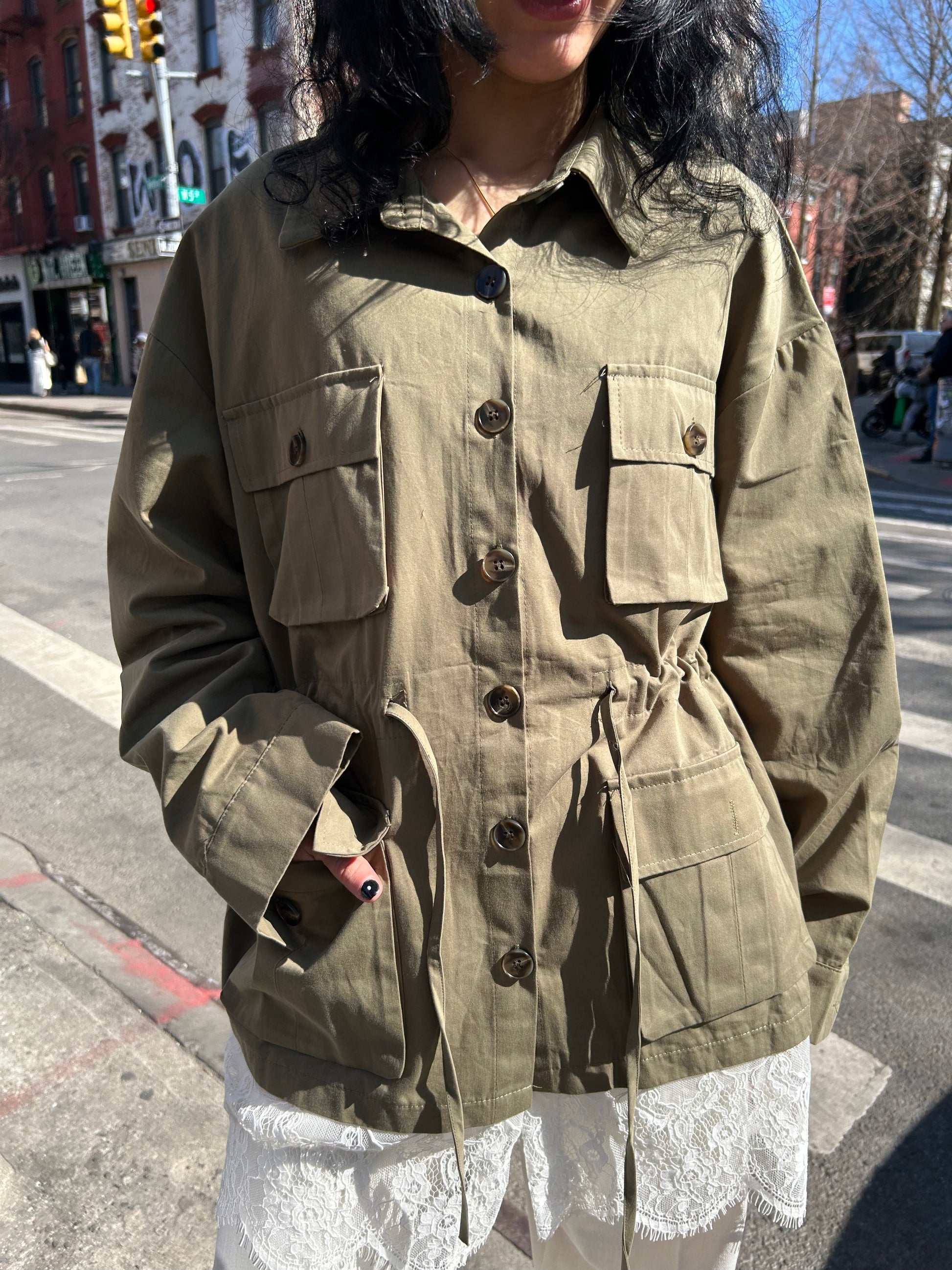 Effortlessly cool and grunge-inspired, our lace trim safari jacket features a drawstring detail for a customizable fit. The lace trim offers a touch of femininity to the edgy design