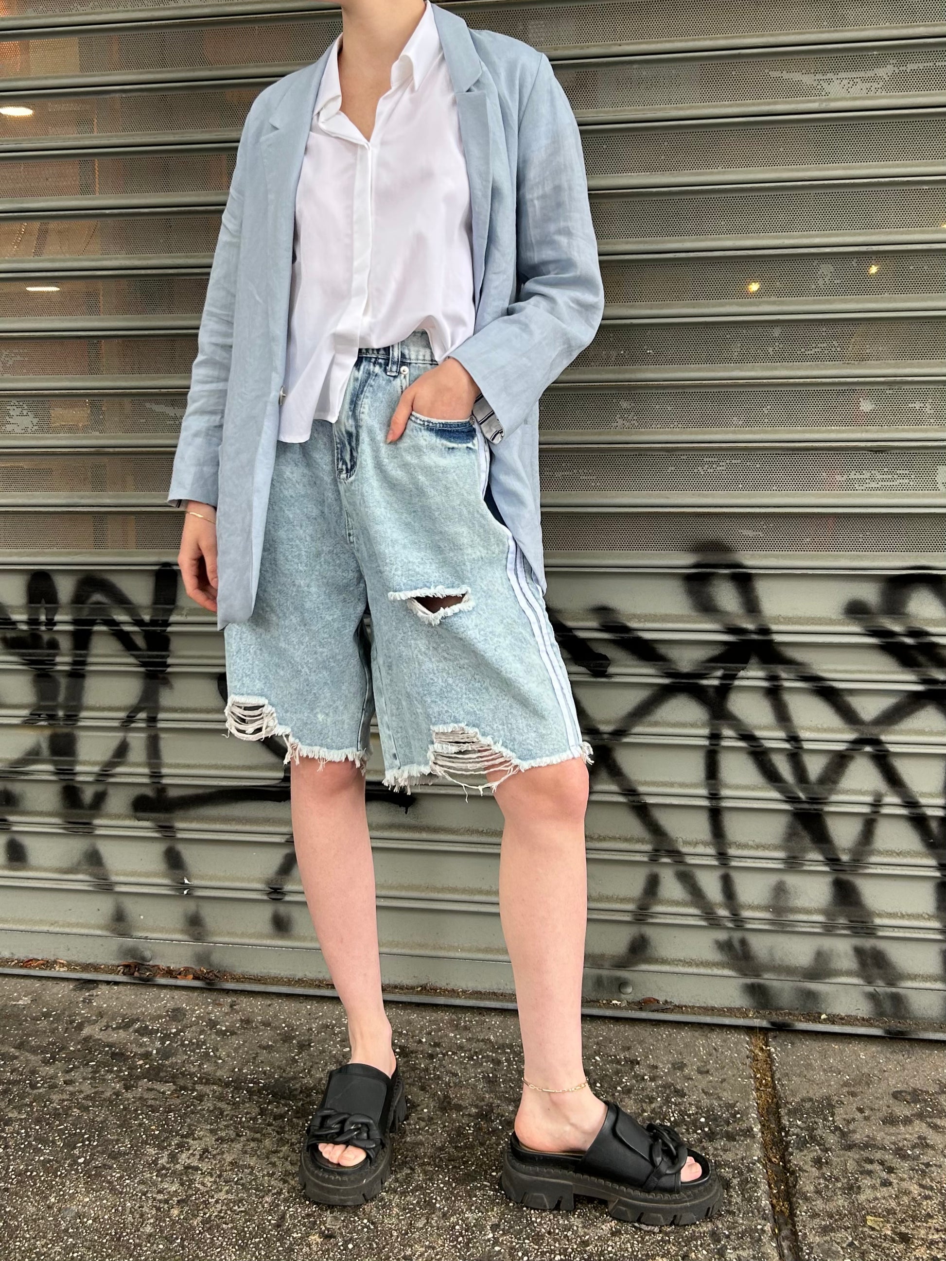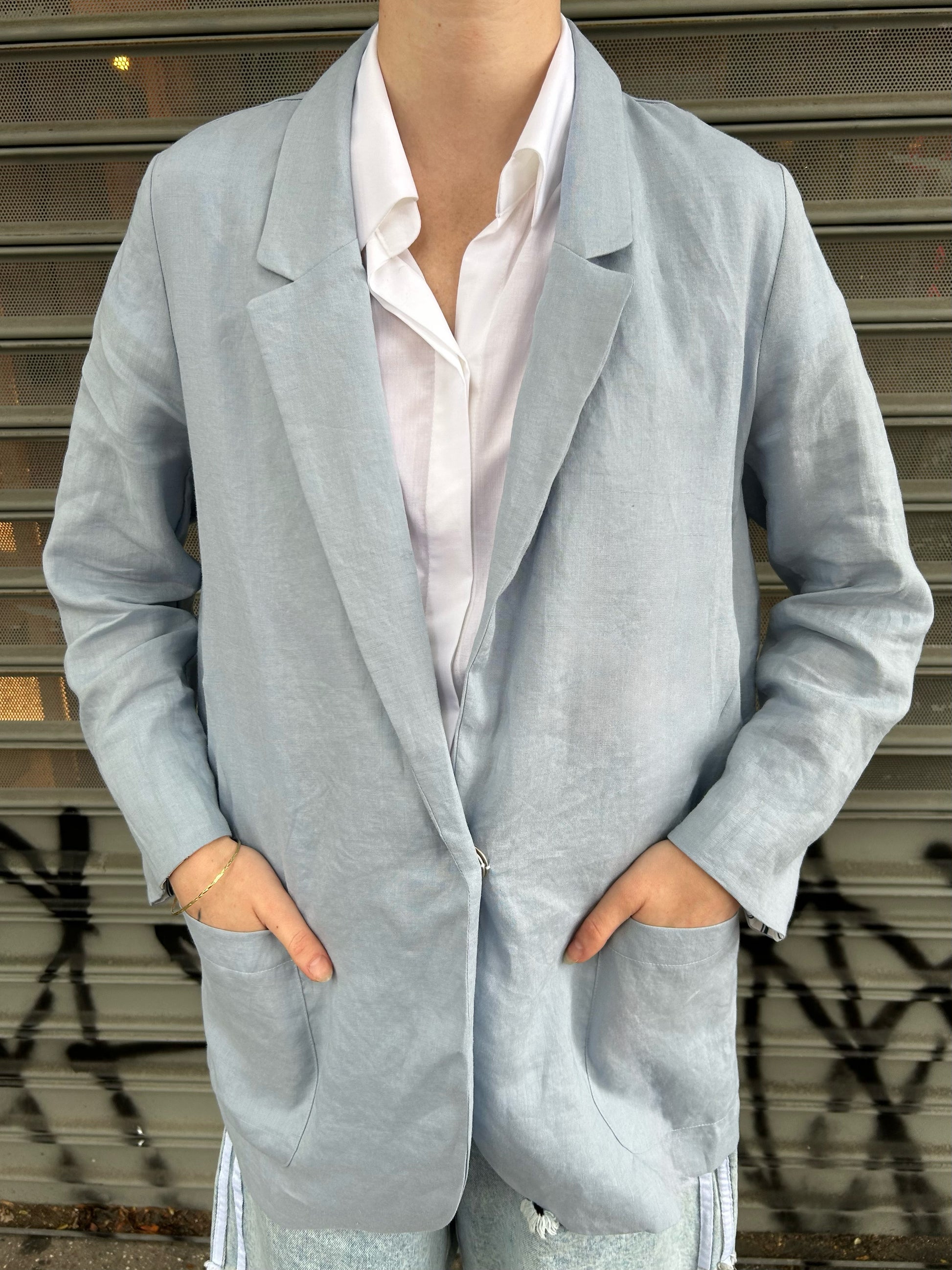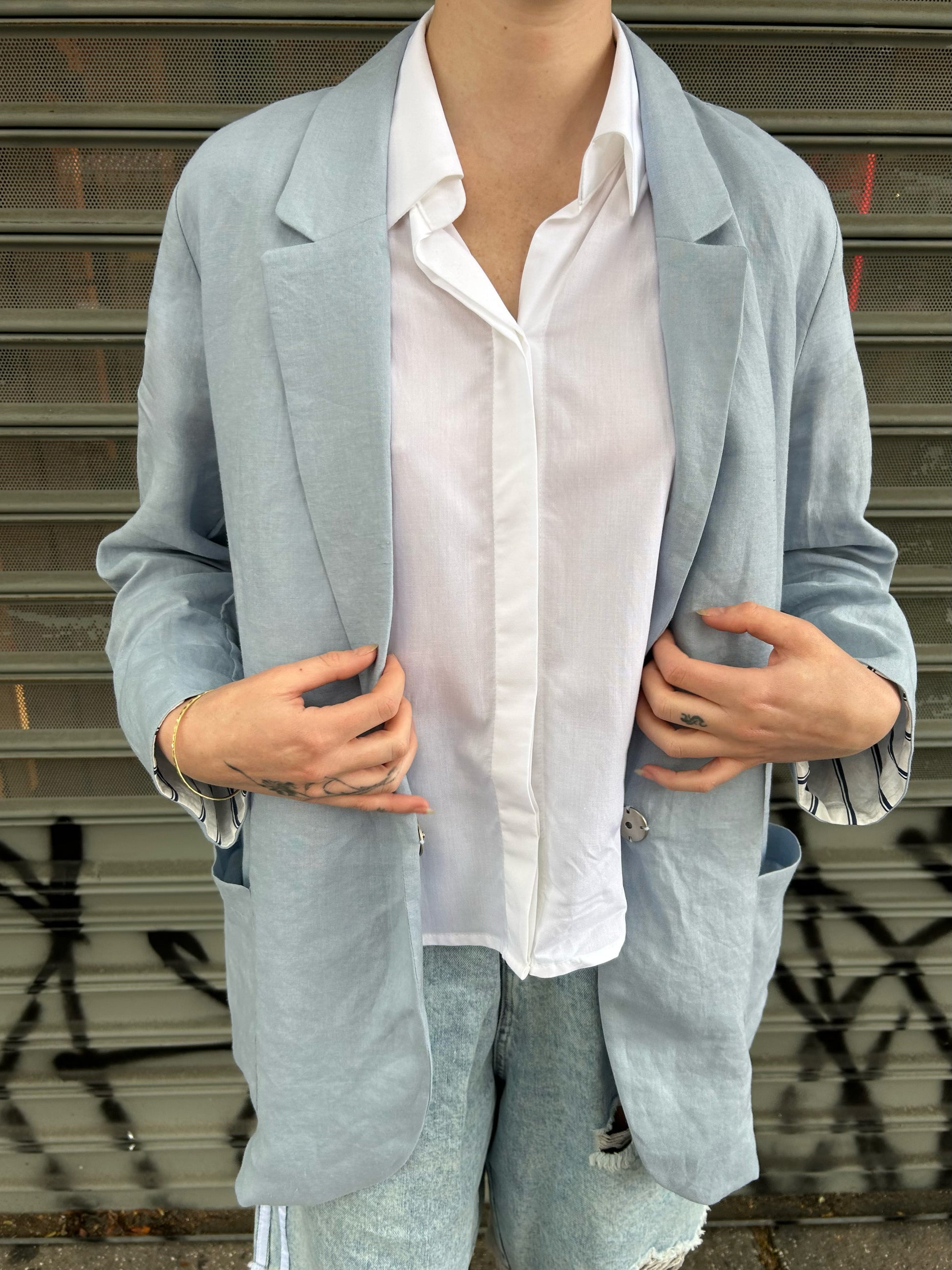 This linen blazer offers a lightweight, breathable fit with distinctive optional striped cuffs. The solid exterior provides versatility while subtle pattern details add unique character.